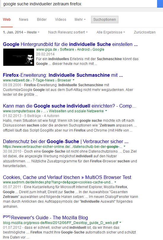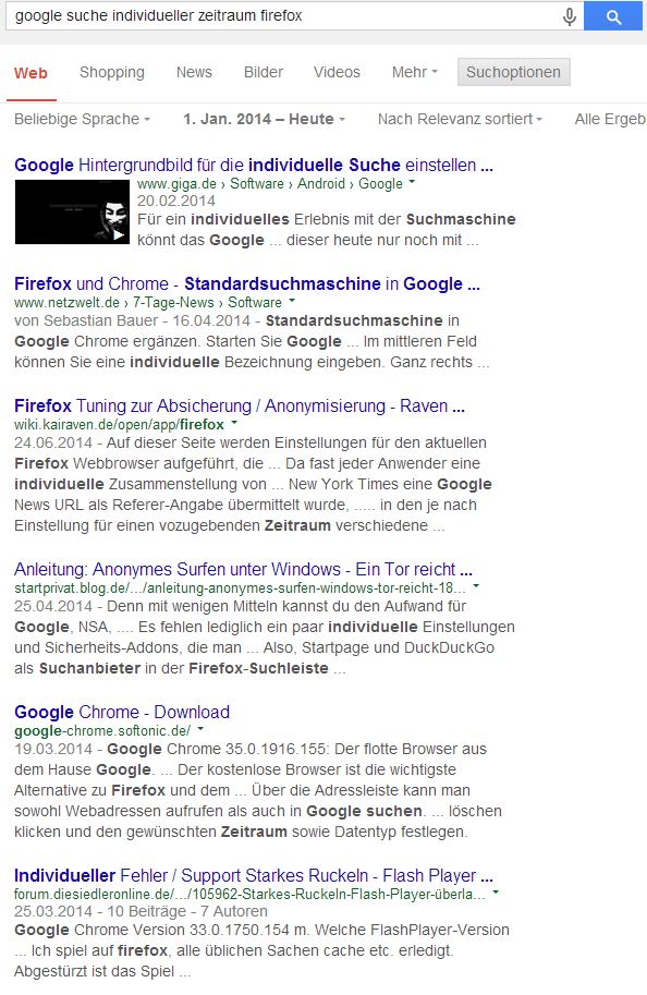 D.h. ich wähle in der Google Suche z.B den Zeitraum "1.Jan.2014 bis heute" und starte die Suche.