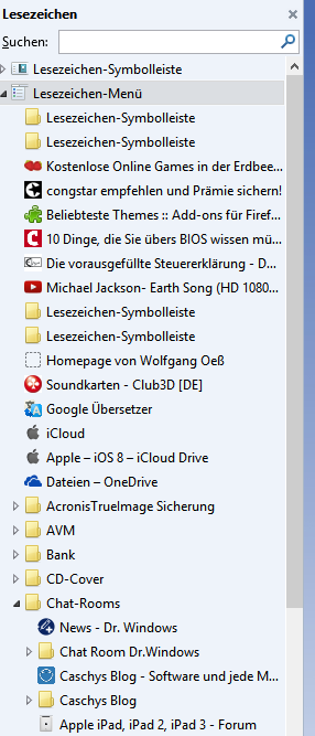 wie ober erwähnt habe ich Probleme mit dem syncronisieren den Lesezeichen zwischen PC und Laptop. Habe ca. 20 Ordner in denen sich jeweil Lesezeichen für das entsprechende Themas befinden. Dazu kommen "über den 20 Ordnern" noch neue Lesezeichen dazu. Diese neuen Lesezeichen habe ich entprechend auch sortiert. Nur erscheinen ein paar von den neuen Lesezeichen die ich ja über den Ordner eingeordnet habe einen Teil wieder dann plötzlich unter den 20 Ordnern.