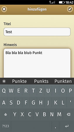 PS: Dieses Kreuzzeichen links oberhalb der Tastatur anklicken bewirkt, daß die Wortvorschläge die aus der App heraus auftauchen, verschwinden. So wird mein "Punkt" übernommen und nicht etwa "Punkte" o.ä. ...