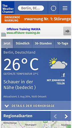 Nach RegenRadar kam noch The Weather Channel in die Testarea, sehr sympatisch gestartet (sinngemäß "Wir haben festgestellt, daß sie Deutsch als Systemsprache festgelegt haben... dabei bleiben ?"), dann aber wieder werbefinanziert- damit werden wir nie Freunde (bei Gefallen der App- die darf dann auch gern etwas kosten, dafür aber keine Werbung/zusätzlicher Traffic/vermutete heimliche Datenaustausche/...) und ab in die Rundablage...