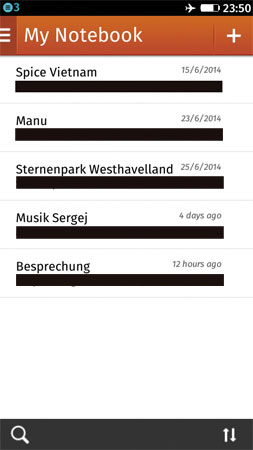Notizen, da wollte ich nachsehen, ob es andere Sachen gibt. Notizen (bzw. My Notebook) zeigt unterhalb der Titel die ersten Textzeichen der Notiz und das kann die Sache in Richtung Übersichtlichkeit schnell kentern lassen (meine Notizen habe ich eingeschwärzt, das ist nicht von der App stammend !).