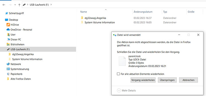 Nun habe ich in Tb den Profilordner aufgerufen und den dortigen Ordner auf Stick kopiert. Der war auch viel länger als der von Fx! Allerdings gab es beim kopieren wieder am Schluß Dateien, die er nicht wollte. Bin auf Überspringen gegangen und hoffe, dass alles da ist. Bevor ich weitermache, möchte ich erst eure Meinung dazu lesen.