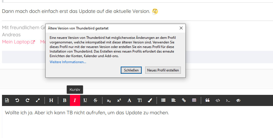 Aber jetzt will man mich ärgern. Ich habe anscheinend im neuen Konto eine ältere TB-Version, die das neue Profil nicht möchte.