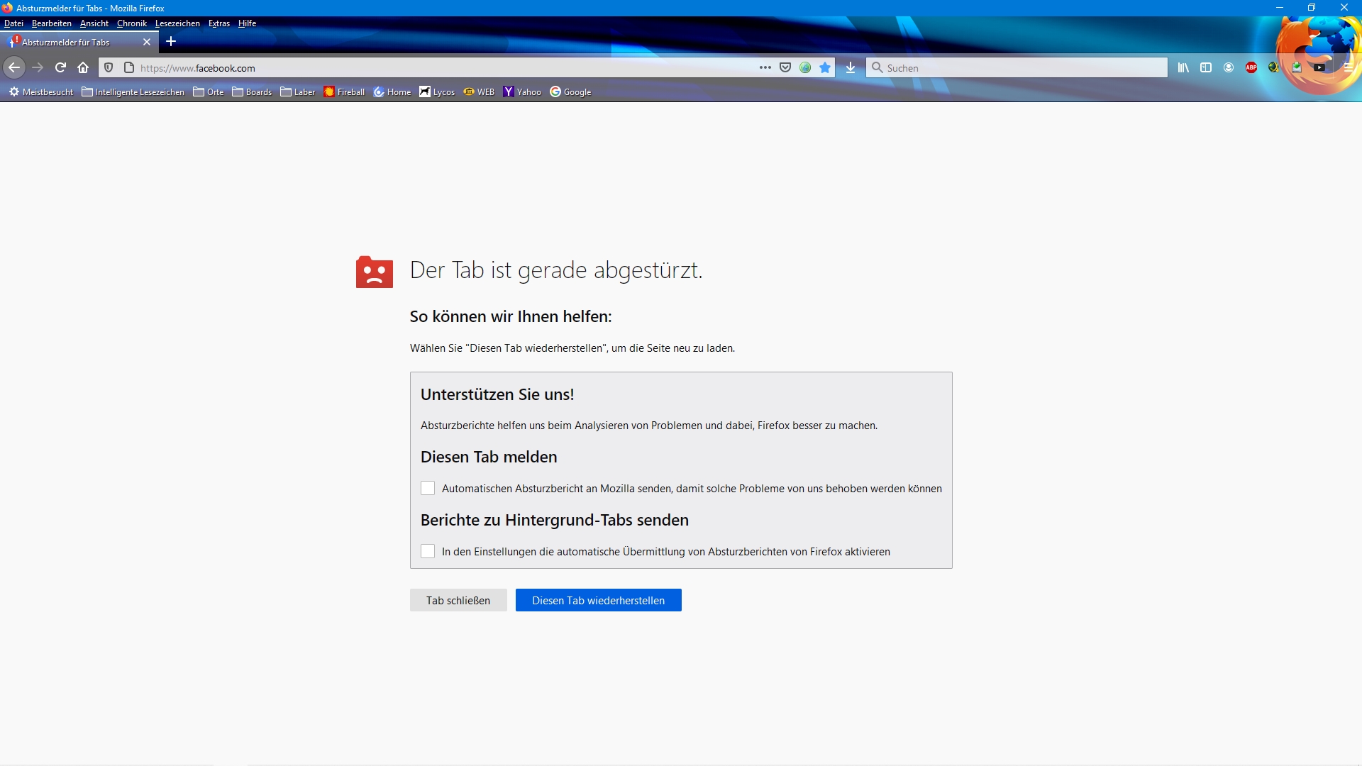 Habe seit der Umstellung von FB des öfteren Tab Abstürze (siehe Bild). Liegt sas nun an FB oder Firefox? Letzteres glaub ich eher nicht, da das nur bei FB auftritt. FB anschreiben ist sinnlos...