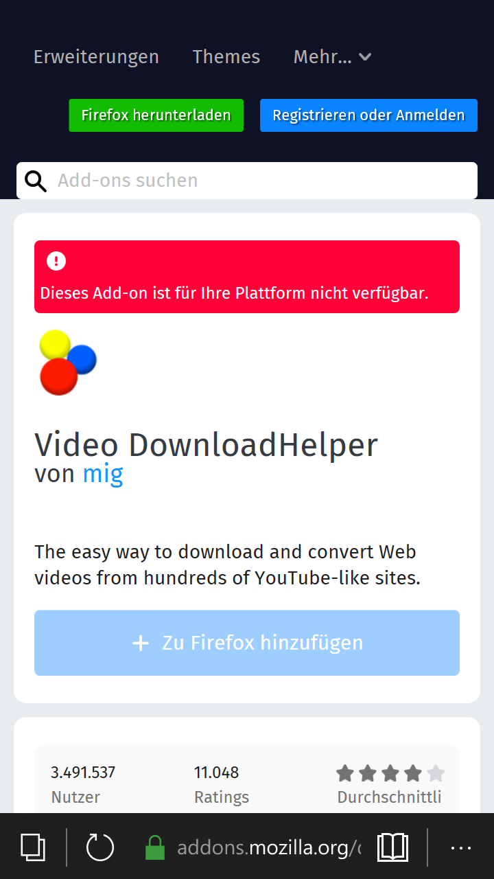 Mir war schon die Überlegung gekommen, ob das von mir genutzte Android, 4.1 und 4.3, zu alt sei, doch immerhin unterstützt Mozilla mit seinem Firefox-Browser für Android das Android-System bis hinunter nach Version 4.1. Warum sollten dann die Erweiterungen nicht mehr funktionieren?Kann irgendjemand hier im Forum das Problem der nicht mehr funktionierenden Downloadhelper-Addons unter Firefox 57, 58, für Android, aufklären?