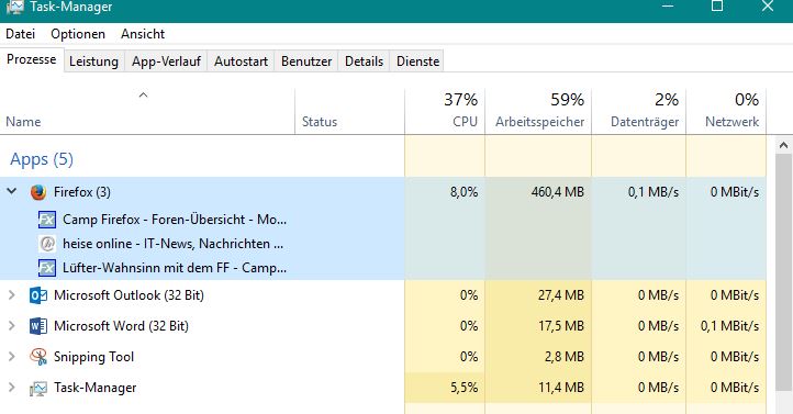 auch im abgeicherten Modus ist das Problem vorhanden und überladen bzw. inifziert ist der FF mal schon überhaupt nicht. Das System wurde vor wenigen Wohen komplett neu unter Windows 10 installiert. Ich halt meine Systeme immer sehr sauber, kein Flash oder sontigen unnötigen Tools und Programme. Auf dem Rechner sind die Standardprogramme von Windows 10 also IE11 und Edge dann ist Office 2016, Acrobat Reader, iTunes,iCloud und natürlich der FF installiert. Sonst ist da nichts. Auch schon vorher unter Windows 7 das gleiche Problem - ist schon sehr lästig.
