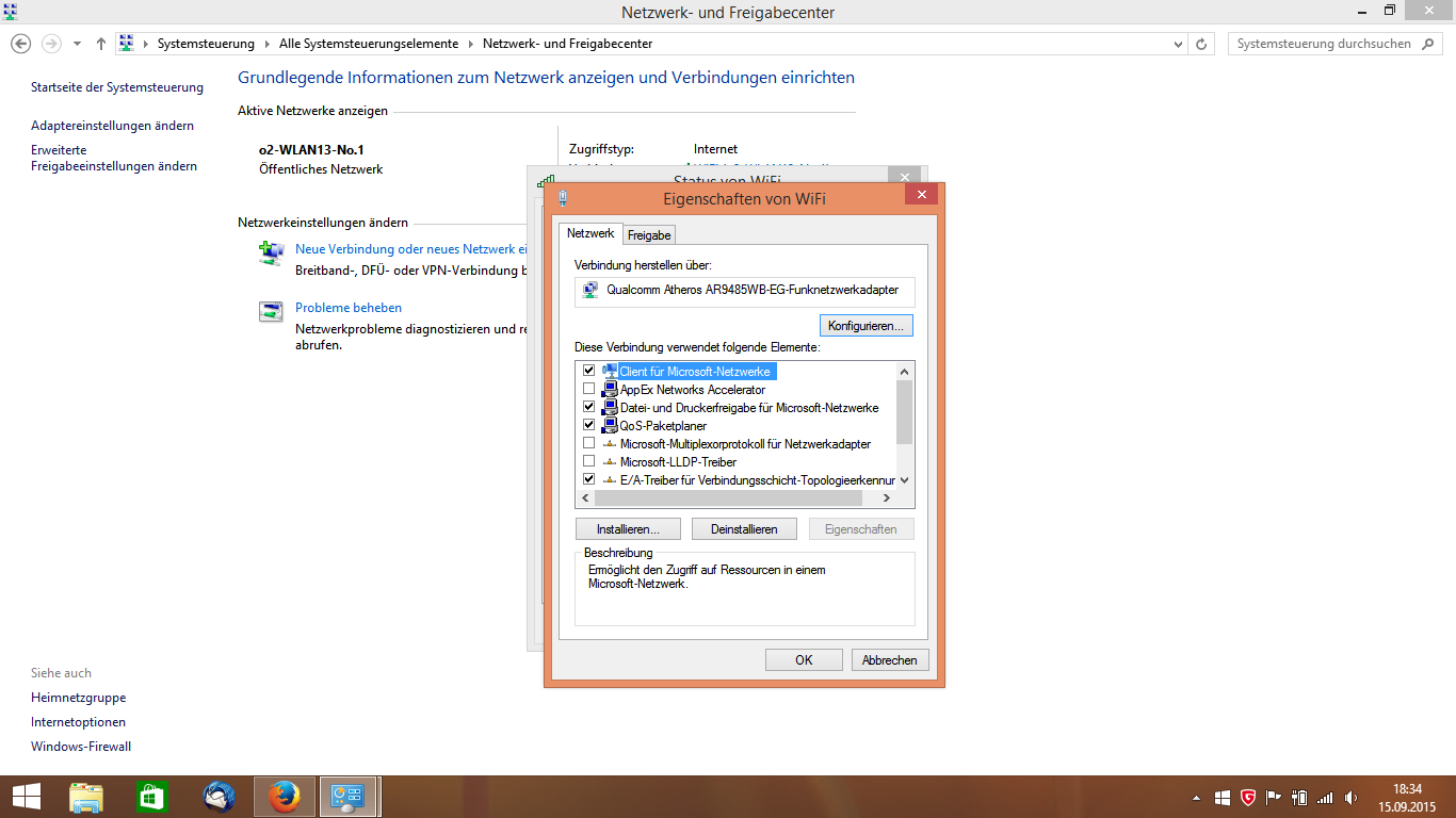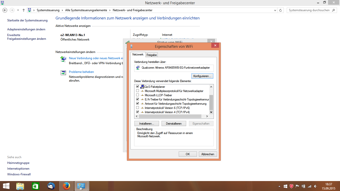 Habe im Netzwerk- und Freigabecenter unter "Eigenschaften von WiFi" mal testweise den Haken bei Internerprotokoll Version 6 (TCP/IPv6) & Internerprotokoll Version 4 (TCP/IPv4) entfernt.