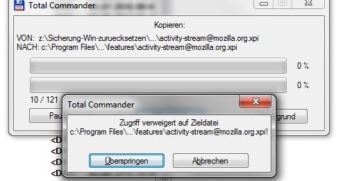 Nur ist meine Frage, warum ich das nicht mit Total Commander aus dem Programm Files Ordner nicht entfernen kann, durch einfaches löschen oder überschreiben, nicht beantwortet. Ich kann jedes Programm daraus löschen oder überschreiben, wenn erforderlich, nur FF und Thunderbird nicht? Ich möchte schon das Verfahren selbst bestimmen und nicht vorgeben lassen. Ich weiß schon was ich tue!