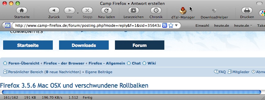 Oh, ein Braunschweiger - meine weitere Heimat, wie schön! Ja, genau, ich habe darauf geachtet, daß keinerlei Add-ons und Themes drin sind, sowohl im SafeMode als auch im Debug-Profile. Komisch was? Könnte es was mit Aqua und OSX zu tun haben?