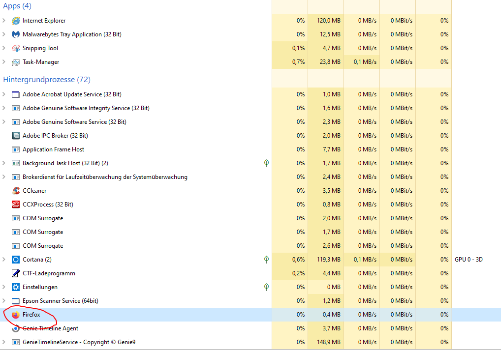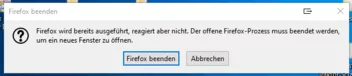 Firefox wird bereits ausgeführt, reagiert aber nicht. Der offene Firefox Prozess muss beendet werden, um ein neues Fenster zu öffnen.