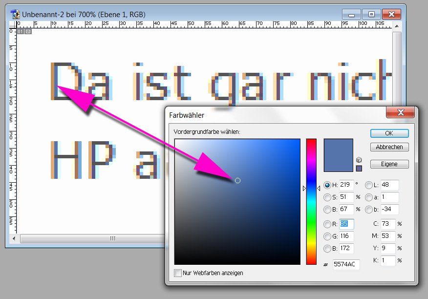 welche Farbe die dunkelste Stelle des Textes tatsächlich aufweist.