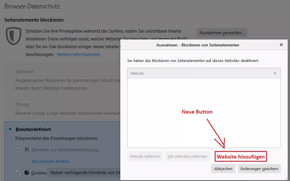 2- Gibt es Möglichkeit eine Button bei "Ausnahmen verwalten" erstellen dass man URL in Liste hinzufügen (Content.jpg)?