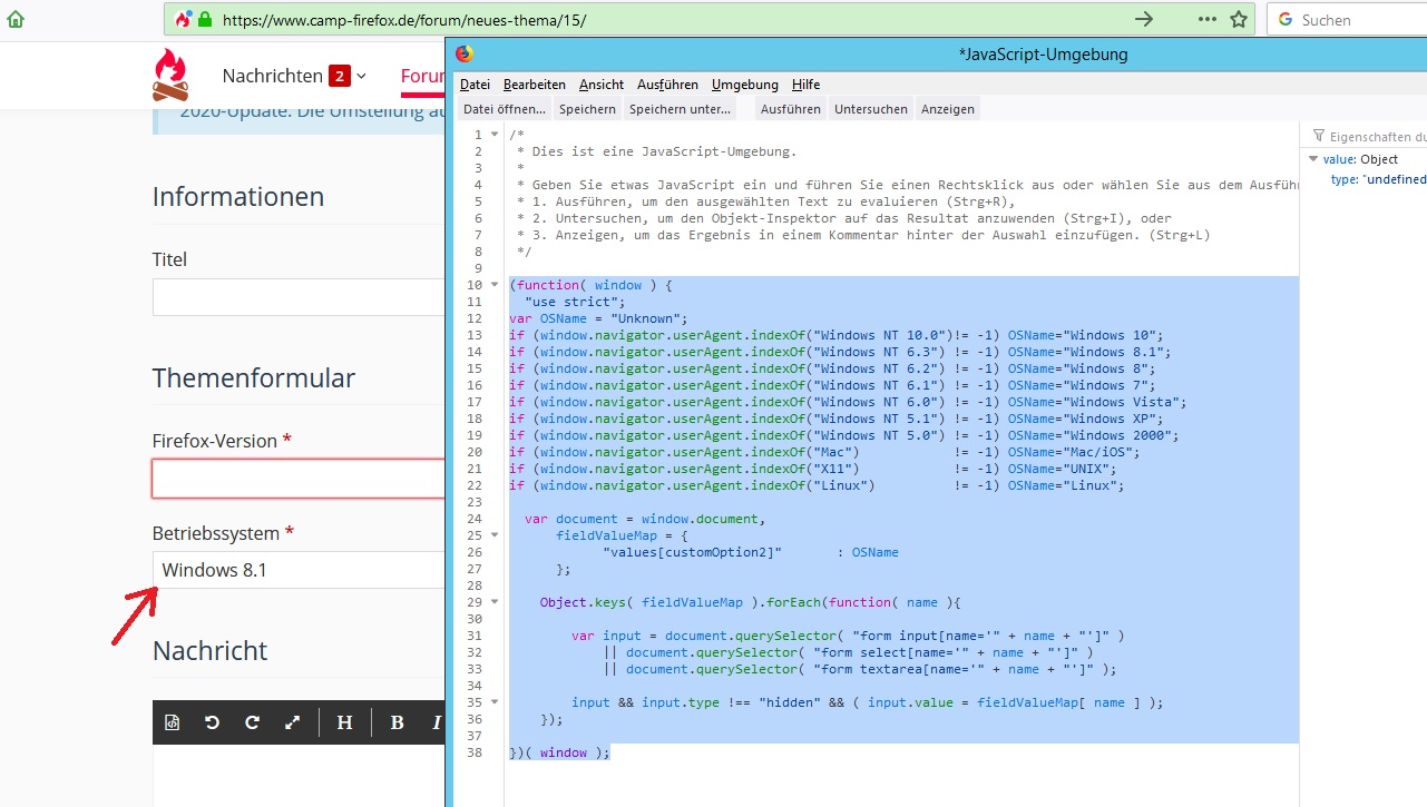 Alles anzeigen(function( window ) { "use strict"; var OSName = "Unknown"; if (window.navigator.userAgent.indexOf("Windows NT 10.0")!= -1) OSName="Windows 10"; if (window.navigator.userAgent.indexOf("Windows NT 6.3") != -1) OSName="Windows 8.1"; if (window.navigator.userAgent.indexOf("Windows NT 6.2") != -1) OSName="Windows 8"; if (window.navigator.userAgent.indexOf("Windows NT 6.1") != -1) OSName="Windows 7"; if (window.navigator.userAgent.indexOf("Windows NT 6.0") != -1) OSName="Windows Vista"; if (window.navigator.userAgent.indexOf("Windows NT 5.1") != -1) OSName="Windows XP"; if (window.navigator.userAgent.indexOf("Windows NT 5.0") != -1) OSName="Windows 2000"; if (window.navigator.userAgent.indexOf("Mac") != -1) OSName="Mac/iOS"; if (window.navigator.userAgent.indexOf("X11") != -1) OSName="UNIX"; if (window.navigator.userAgent.indexOf("Linux") != -1) OSName="Linux"; var document = window.document, fieldValueMap = { "values[customOption2]" : OSName }; Object.keys( fieldValueMap ).forEach(function( name ){ var input = document.querySelector( "form input[name='" + name + "']" ) || document.querySelector( "form select[name='" + name + "']" ) || document.querySelector( "form textarea[name='" + name + "']" ); input && input.type !== "hidden" && ( input.value = fieldValueMap[ name ] ); }); })( window );Mfg