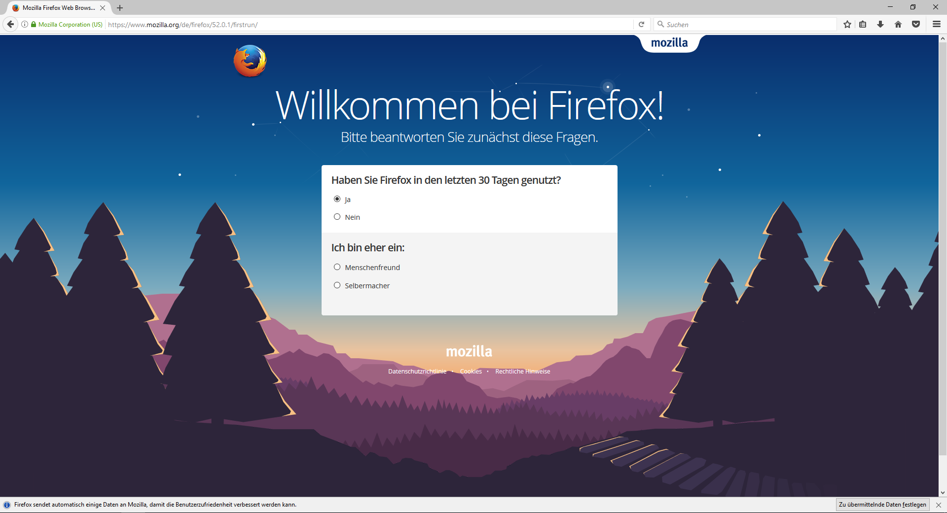ich habe eben auf meinem neuen System Firefox installiert. Als ich den Browser im Nachgang direkt öffnete, öffnete sich eine Seite von Firefox. Mit der ersten Frage "Haben Sie in den letzten 30 Tagen Firefox genutzt?" Als ich ja anklickte erschien die Frage "Sind sie Selbermacher oder Menschenfreund?" Meine Frage ist nun, sind diese 2 Fragen normal, da ich sie zuvor nie hatte?