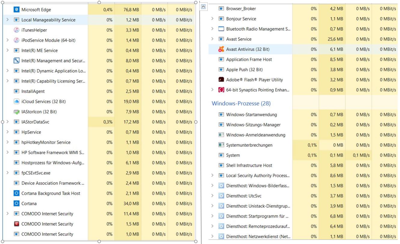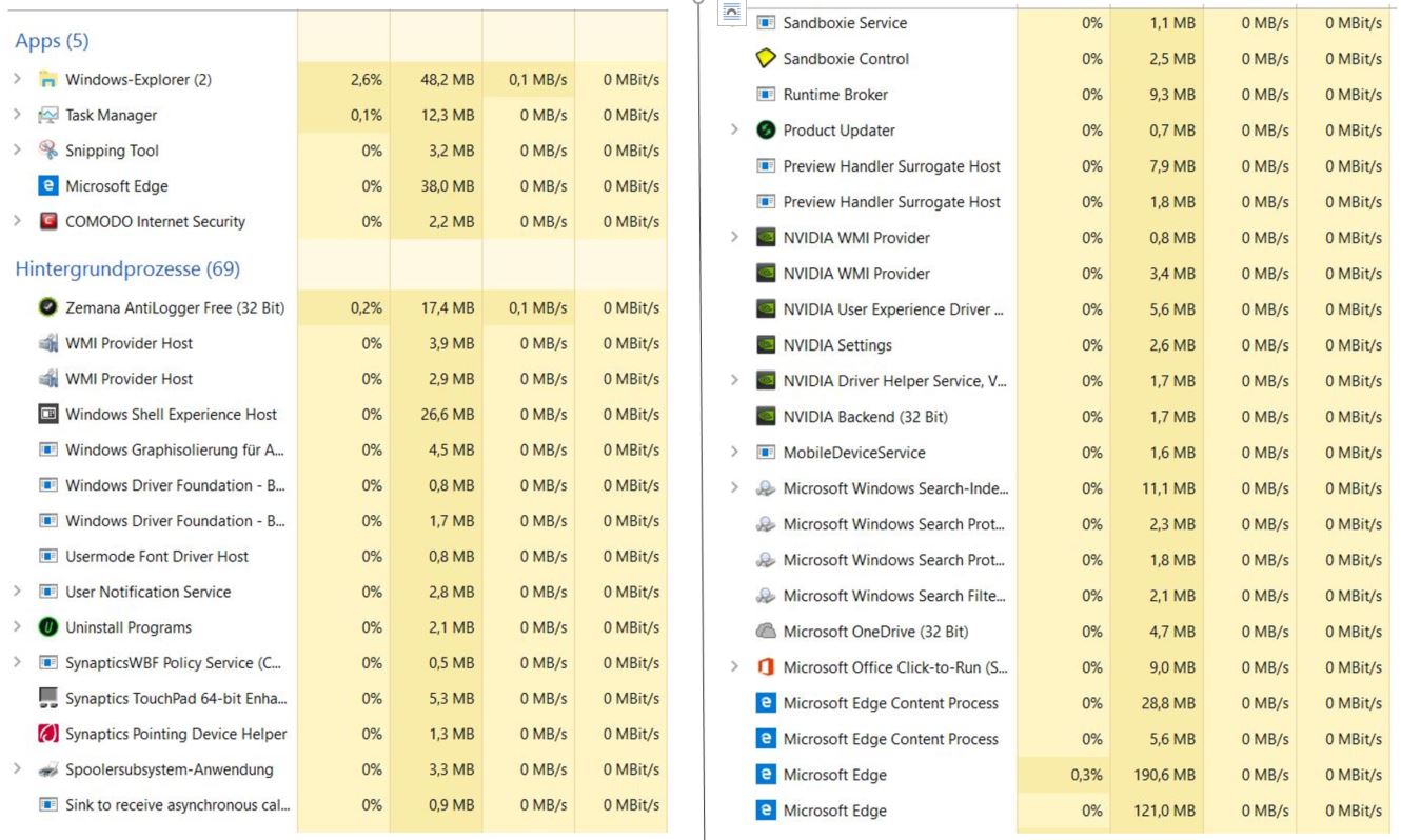 Möchtest Du nach bestimmten Prozessen im Taskmanager suchen oder kannst Du mir sagen nach was ich schauen soll? Irgendwie bekomme ich das mit den Screenshots nicht hin und es wären auch mehrere Prozesse.