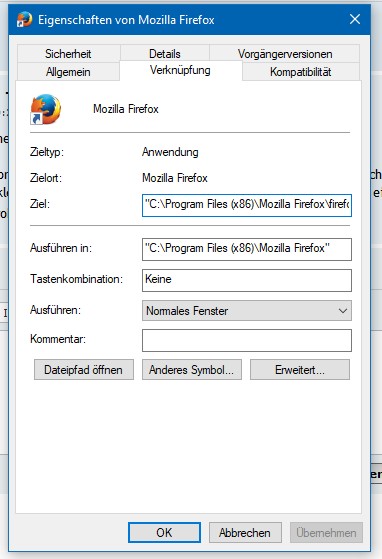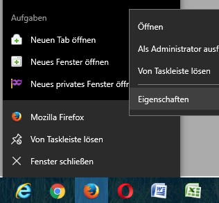 Rechtsklick auf FF-Icon -> Rechtsklick auf 'Mozilla FireFox' -> Klick auf 'Eigenschaften'[attachment=1]FF-icon1.jpg[/attachment][attachment=0]FF-icon2.jpg[/attachment]