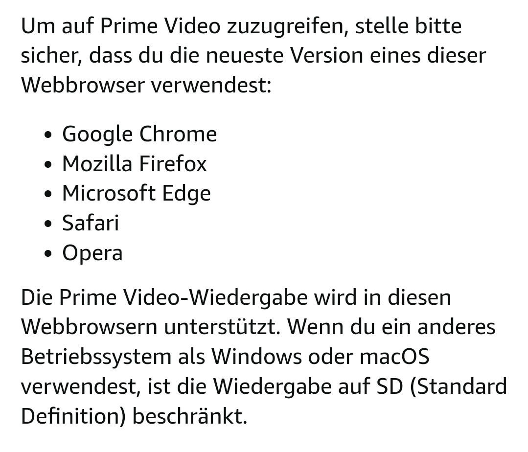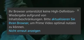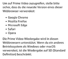 Amazon unterstützt die Wiedergabe in High Definition über einen Webbrowser nur auf Windows oder macOS. Auf Mobiltelefonen, Tablets oder TV-Sticks werden die Videos generell nur in SD-Qualität abgespielt.