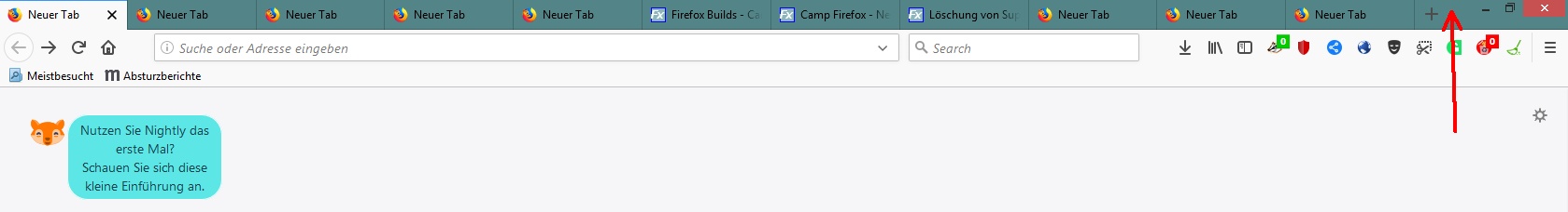 Gut, ich habe schon ein paar Erweiterungen installiert, aber noch keine die das Aussehen oder Verhalten von Tabs beeinflusst. Will ich das Fenster jetzt anfassen und verschieben dann geht dass auf dem schmalen Stück rechts dort wo ich den Pfeil eingezeichnet habe oder durch zusätzliches drücken der "alt"-Taste.