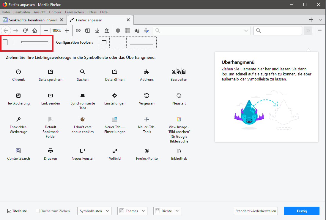 Firefox beendet, Script gelöscht, Firefox gestartet: Alle Symbole unter "Anpassen" weg, Trennlinien aber noch da!