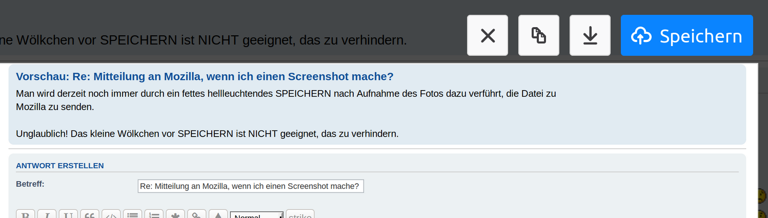 Man wird derzeit noch immer durch ein fettes hellleuchtendes SPEICHERN nach Aufnahme des Fotos dazu verführt, die Datei zu Mozilla zu senden. :grr: