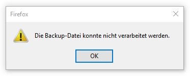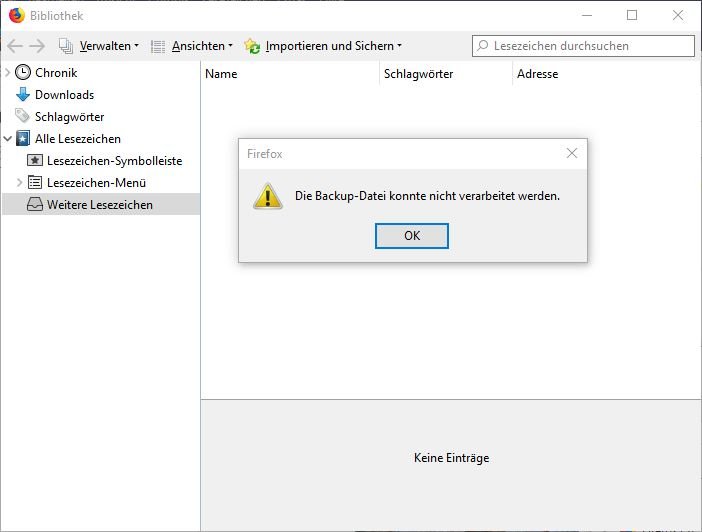 - Import von bookmarks.json, die vorher unter Fx57+x im aus places.sqlite erstellten Profil exportiert wurde