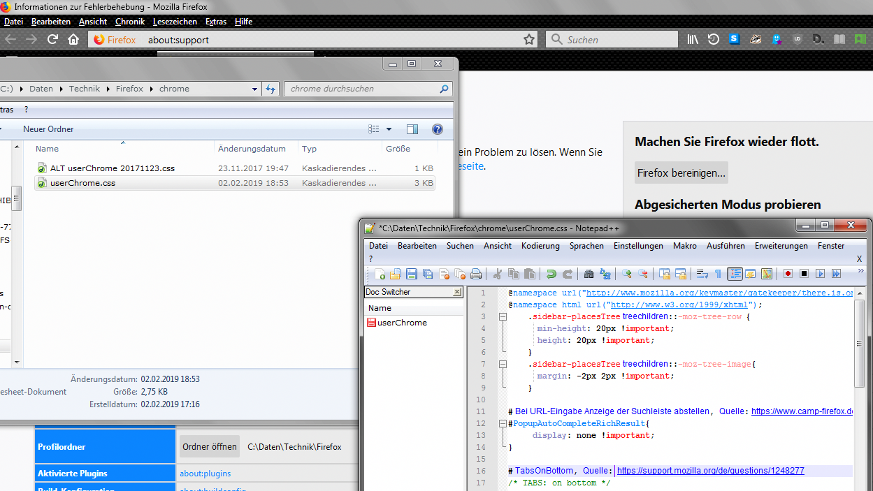 derzeit: Keine, Firefox/chrome/userChrome.css ist umbenannt in Firefox/chrome/GehtNichtuserChrome.css