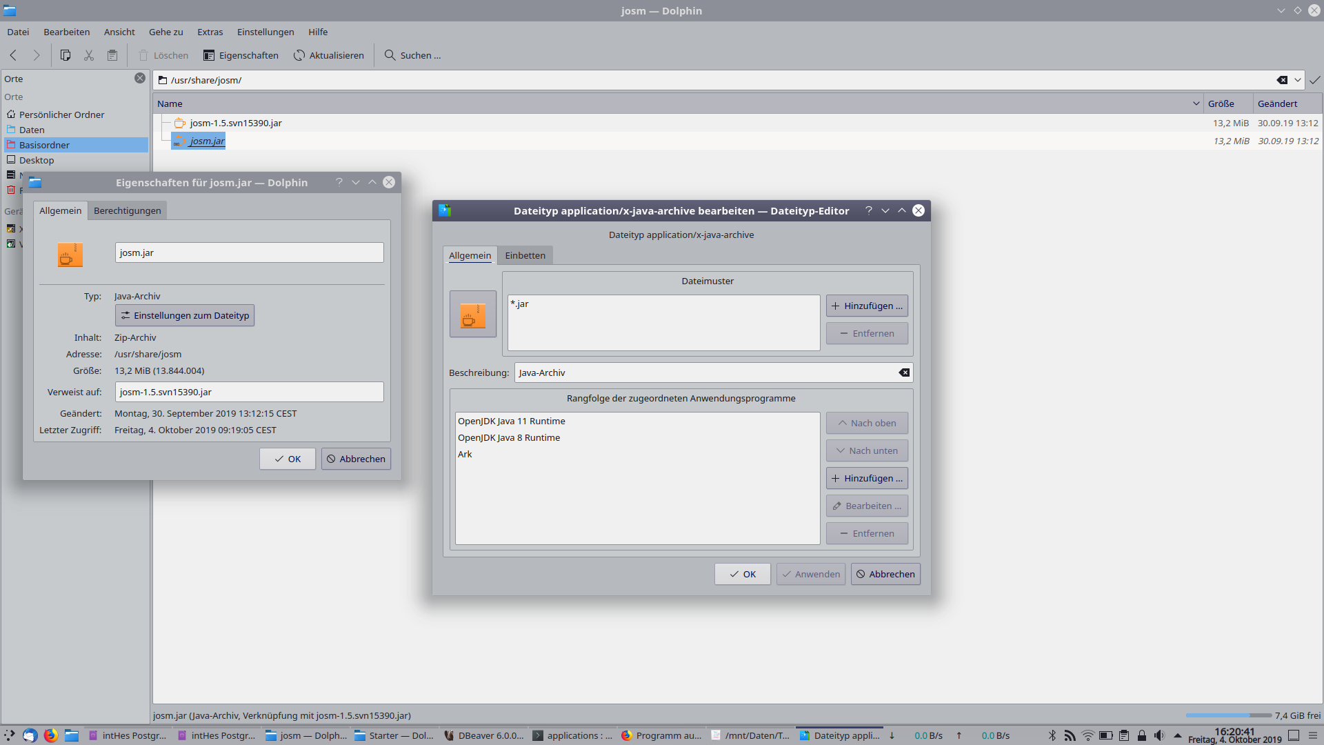 Ich habe auch eine josm.desktop-Datei, die "ausführbar" markiert ist und vom Desktop aus oder per DOLPHIN-Doppelklick aus ihrem Speicherort heraus gestartet werden kann: