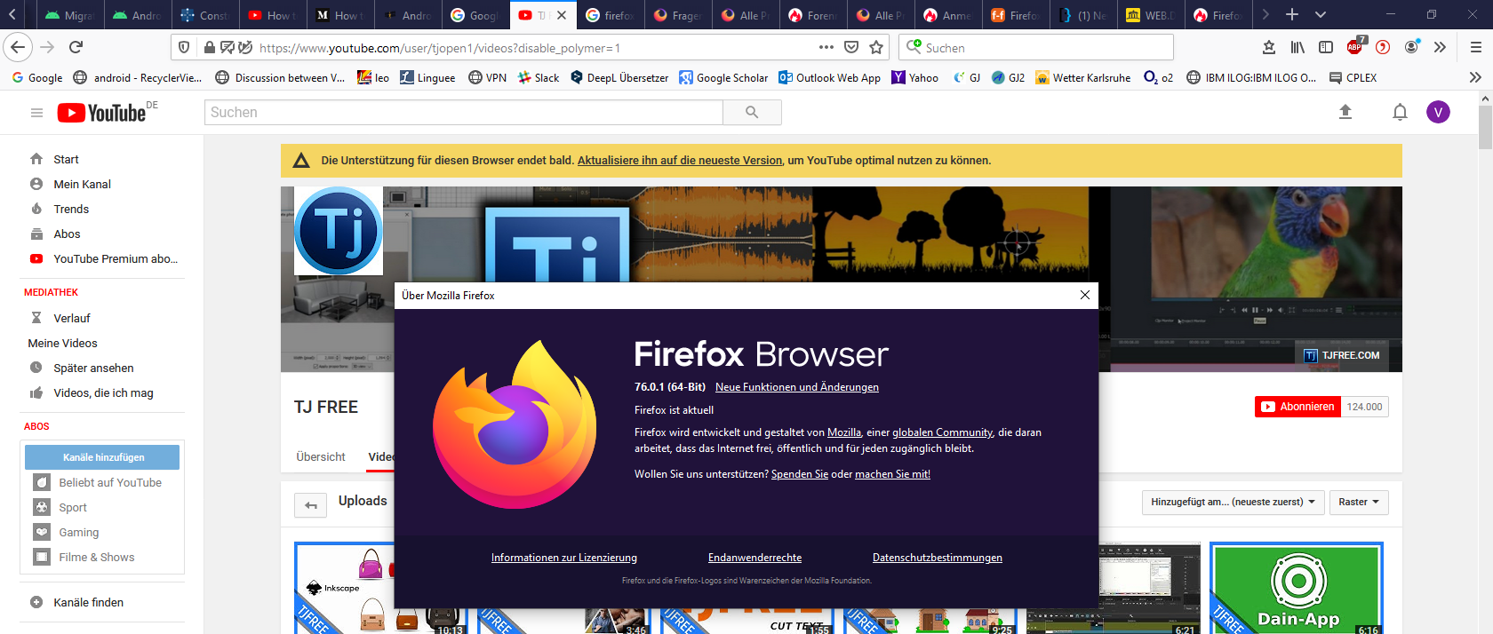 ich habe seit langer Zeit ein Problem. Auf einigen Webseiten, insbesondere Youtube, wird mir angzeigt, dass mein Browser veraltet ist und ich updaten sollte. Jedoch habe ich bereits die aktuelle Version von Firefox (76.0.1). Es geht bei einigen Seiten sogar soweit, dass ich den Inhalt nicht sehen kann, weil mein Browser veraltet sei. Hat jedmand eine Idee, woran das liegen könnte. Ich habe ein Screenshot hinzugefügt mit der Warnung und der Version von Firefox. Ich würde mich über Antworten sehr freuen und wäre dankbar.