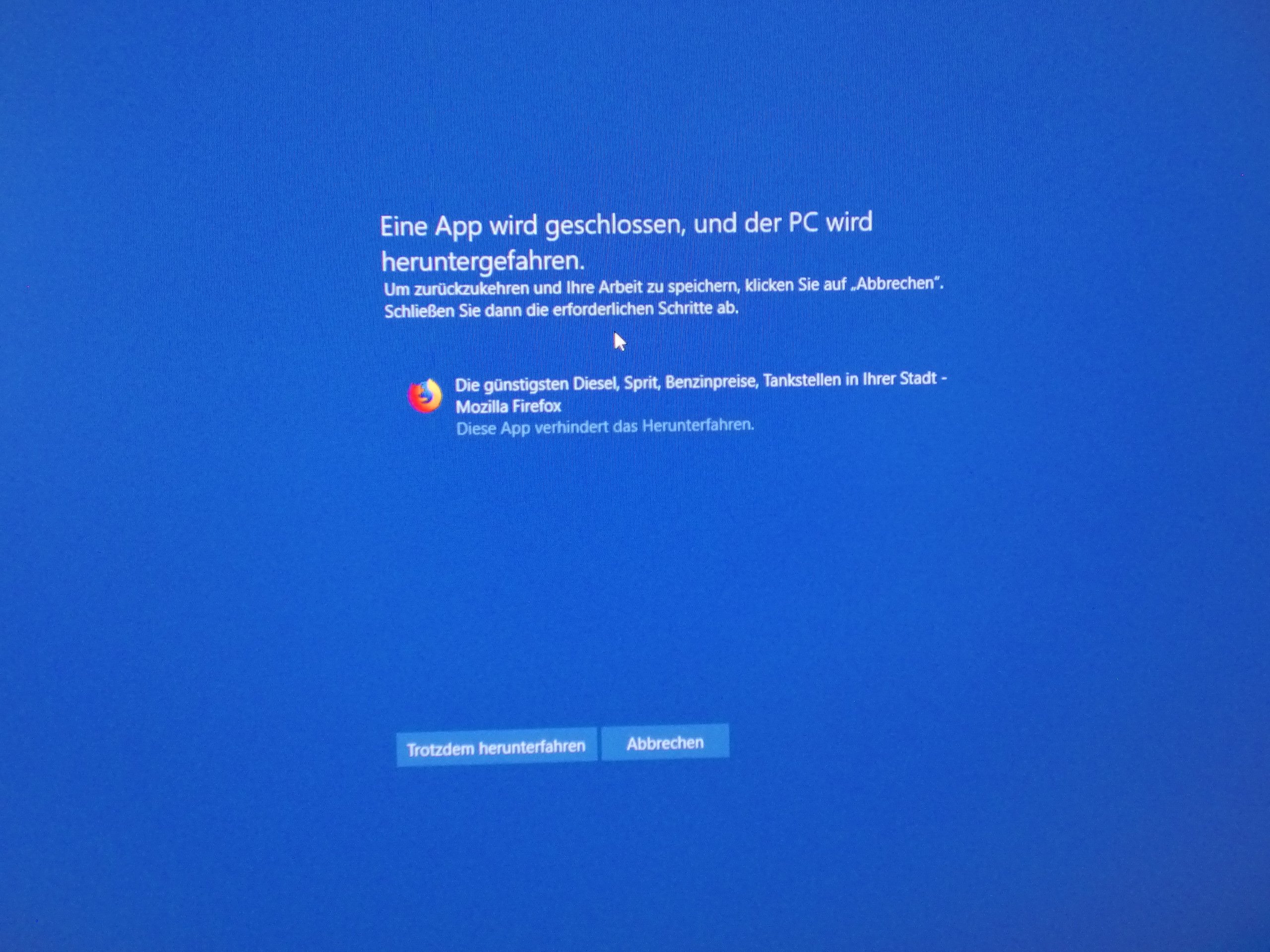 Oder ich kann anklicken, es soll trotzdem runtergefahren werden.Tu ich nichts, dann schaltet Win10 nach ca. 35 Sekunden trotzdem ab.