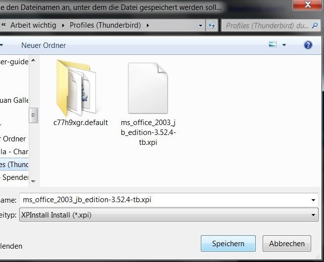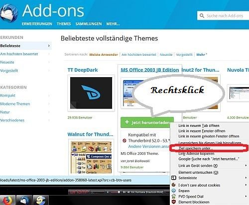 Im Kontexmenü....Ziel speichern unter....angeklickt. Nun wird die xpi- Datei auf einen vorher erstellten Ordner gespeichert.