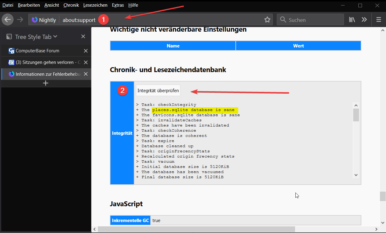 Versuche daher unter about:support (in Adresszeile eingeben oder alternativ unter Hilfe --> Informationen zur Fehlerbehebung) einen kurzen Integritätscheck mittels der dort vorhandenen Schaltfläche --> siehe angehängten Screenshot.[attachment=0]firefox_2018-09-30_05-53-34.png[/attachment]