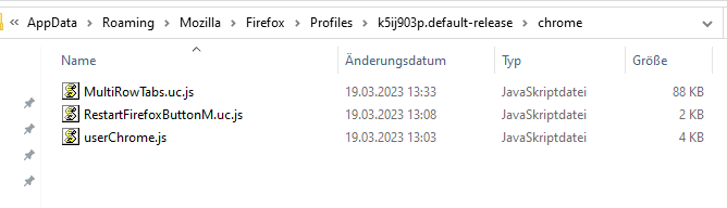 Danach habe ich noch das "MultiRowTabs.uc.js" angelegt und in den "chrome" Ordner im Profil gepackt.