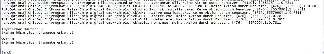Hallo Parker, Ergebnis abgebrochen - der Rechner hatte sich anfangs bei Beginn des Scans komplett aufgehängt, nichts ging mehr. Nachdem ich 30 Minuten gewartet hatte ob er wieder arbeitet, habe ich ihn ausgeschalten, neu gestartet und einen neuen Scan gestartet, der dann einwandfrei lief