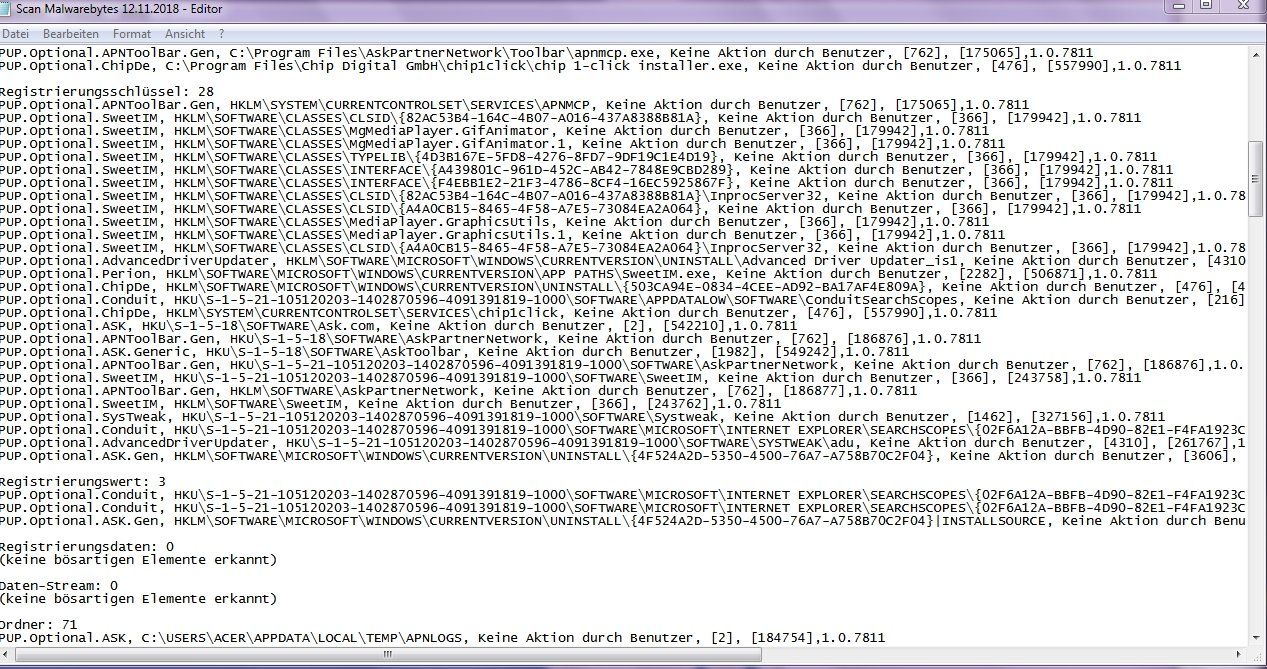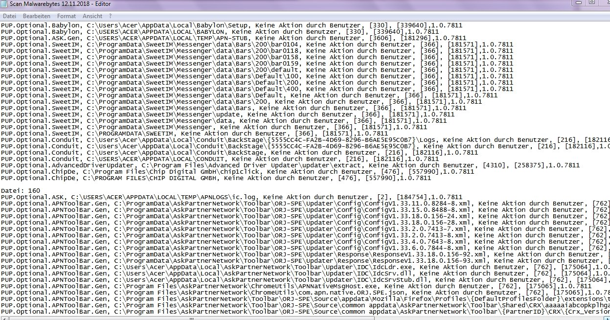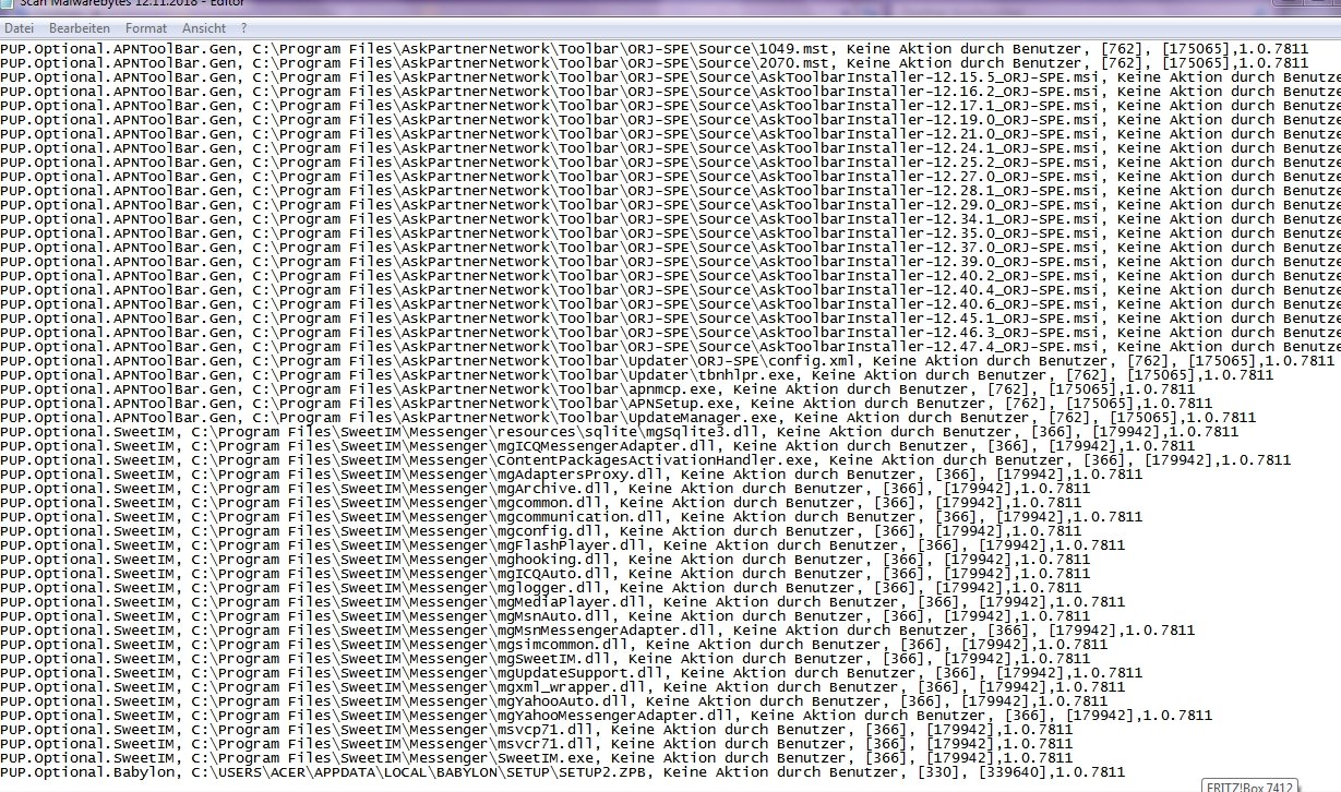 Hallo Fox2Fox, hier die Ergebnisse des Scans mit Malwarebytes, als Anhang angefügt. Habe nichts gelöscht. Weitere Anweisungen von Malware... kamen nicht, lediglich ein Neustart. Der Scan Report wird von Malwrebyte als txt gespeichert, kann ich hier nicht anhängen, ebenso lässt sich der Malwaretes.ink Bericht hier nicht einfügen