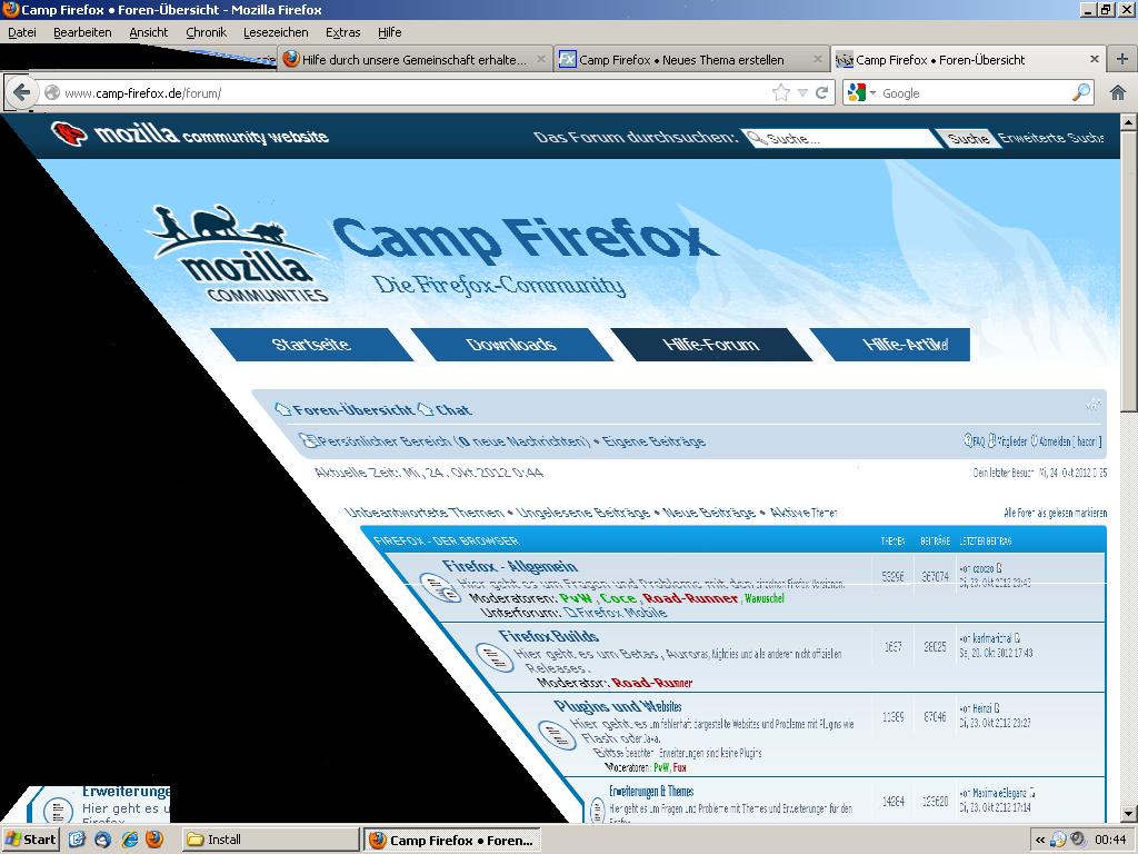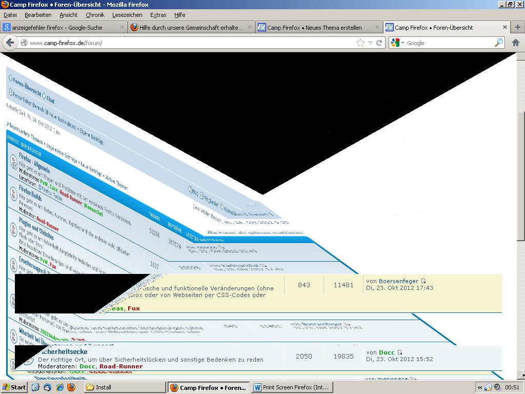 Ich hatte schon daran gedacht, dass ich mir ev. einen Virus eingefangen habe, weil fast gleichzeitig meine Windows 7 Festplatte im gleichen Computer einen Totalausfall hatte. Da das Problem aber nur im Firefox erscheint und nicht im Internet Explorer oder anderer Software und ein Virenscan keine Ergebnisse erbrachte, kann ich mir das inzwischen nicht (mehr) wirklich vorstellen. Anbei hänge ich zwei Print Screen an, welche die Hauptseite dieses Forums zeigen, damit ihr euch ansehen könnt, was ich meine. Ein Video würde zwar besser zeigen, wie sich das Ganze verhält, aber die Print Screens zeigen das grundsätzliche Problem ebenfalls. Es ist echt total mühsam, vor allem wenn ich irgendwelche Formulare ausfüllen möchte.