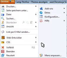 CSS#AppMenuButton{ padding:0 !important; margin:0 0 6px 0!important; background: #FFF !important; } #AppMenuButton > dropmarker{ display:none !important; }Außerdem kann man jetzt in der Script Zeile 163 bestimmen, ob der Appbutton in der Tabs Toolbar, oder in der Urlbar erscheinen soll. In der Urlbar sieht er dann anders aus (in der Zeile 178 als Base64 Code).