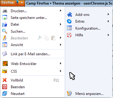 Ich habe loshombres Beitrag, auf den ich mich bezogen habe, wohl missverstanden. Ich dachte, er hätte statt des Buttons ein Menü in der Menüleiste. Ich hätte tatsächlich gern einen Menüeintrag im Firefoxmenü - ich bin noch bei FF28 und benutze die Erweiterung "Personal Menu".ZitatKannst Du ein Bild machen und mir darauf Zeigen wo genau Du das Symbol hin haben willst? Dann ändere ich das für Dich gerne. Ich kann aber nur das Symbol anderswo ablegen.