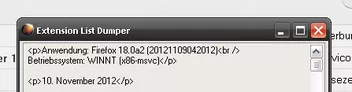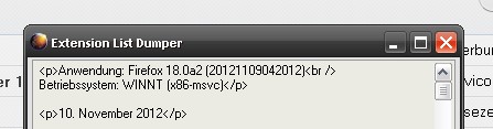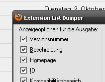 Im Ordner extension_list_dumper-1.15.2-fx+tb+sb\chrome\chromeFiles\content fügen wir in der Datei options.xul nach Zeile 23: "title="Extension List Dumper"" z.B. folgende Zeile ein: