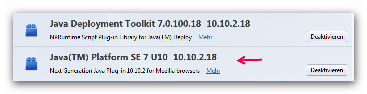 Ich konnte das Problem so lösen. Zuerst deinstallierte ich Java. Dazu nahm ich den Revo Uninstaller. Wer ihn auch verwenden möchte, kann ihn hier herunter laden: http://www.chip.de/downloads/Revo-Uninstaller_27291156.html . Jetzt schaute ich noch im Programm - Ordner nach, ob auch der Java - Ordner gelöscht wurde. Was nicht der Fall war. Ich löschte ihn per Hand. Sicherheitshalber startete ich den Rechner neu. Dann installierte ich die aktuellste Java Version. Nach der Installation startete ich den Rechner nochmal neu. Hier überprüfte ich jetzt, ob Java wieder funktioniert: http://java.com/de/download/installed.jsp . Wenn das der Fall ist, sieht das aus wie am Screenshot. In den Add - ons von Firefox sind jetzt wieder diese beiden Plugins vorhanden. Ich glaube das es deshalb nicht mehr funktionierte, weil das mit dem Pfeil markierte Plugin nicht mehr vorhanden war. Hoffe, diese Anleitung klappt auch bei euch.