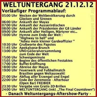 Ja, es könnte noch damit zusammenhängen. Habt ihr eventuell schon gehört, ob das Inselstaaten westlich der Datumsgrenze oder gar schon Japan untergegangen sind? Da geht die Sonne lange vor uns auf.Übrigens: In Dresden wird heute wirklich eine Weltuntergangsparty gefeiert. Informationen MDR Videotext Seite 161.