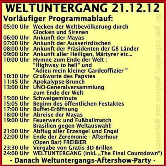 Es sind ja nicht die Mayas, die den Weltuntergang vorhersagten, sondern nur ein paar unverbesserliche Esoteriker. Für die Mayas geht nur eine Kalenderzählung zu Ende. Danach fängt eine neue an. -