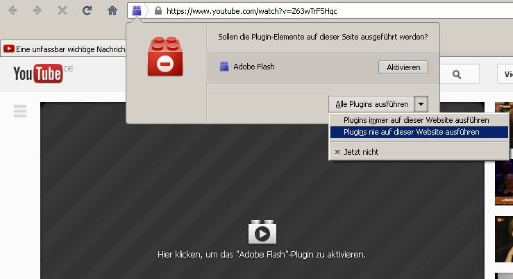 ich hätte da mal einige Fragen zum Click-to-Play Feature. Ich habe jetzt mal den about:config-Eintrag plugins.click_to_play auf true gesetzt. Beim Aufruf etwa eines Youtube-Videos öffnet sich nun durch Klick des Symbols in der Adressleiste ein Panel, wo man Berechtigungen einstellen kann (siehe Bild). Dort kann man Flash "aktivieren", sowie Plugins "immer/nie auf dieser Webseite ausführen" wählen. Diese Einstellungen scheinen aber nur temporär zu sein. Sobald ich die Seite neulade (im Fall von Flash "Aktivieren") bzw. nach einem Neustart von Firefox (im Fall von "Alle Plugins immer/nie auf dieser Webseite ausführen"), muss ich erneut "Klicken um (ab)zu spielen".