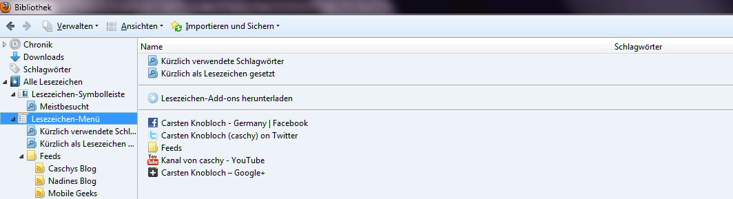 Vor kurzem ist mir aufgefallen, dass diese Leiste, wo ich den Ordner wählen konnte, nicht mehr existiert, d.h. ich muss mich nun mit u.U. langen Listen begnügen, die ich nicht mehr auf bestimmte Ordner eingrenzen kann (z.B. "zeige alle Ergebnisse für den Ordner xyz"). Ich nehme an, dass das seit Fx 19.0 so ist. Oder war das garkein fuchsnatives Verhalten, sondern kam von einer Erweiterung?