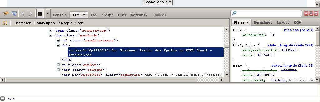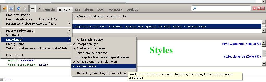 Wenn ich im HTML-Panel die "Styles" anschaue, dann ist die Spalte mit den Angaben "css .., Zeile ..." unendlich weit rechts. Wenn ich das Firebug-Fenster verkleinere, dann verschwinden die CSS-Hinweise.