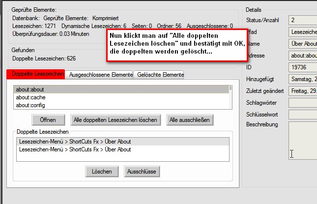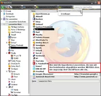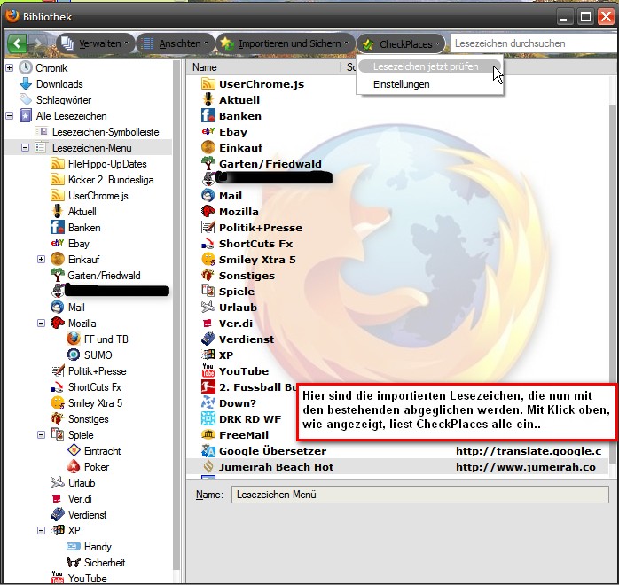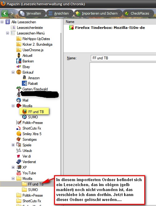 Checkplaces vergleicht die installierten Lesezeichen ( auch die, die wie bei mir via importierten bookmark.htmls eingelesenen von anderen Fuchs-Versionen) und löscht auf Klick die doppelten bzw dreifachen etc. etc. Man muss dann nur noch händisch in der Bibliothek die importierten Ordner durchschauen, ob dort noch Lesezeichen sind, diese in den jeweiligen entsprechenden bestehenden Ordner verschieben und abschließend die leeren Ordner löschen....