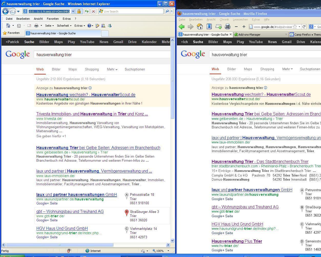 Wenn ich bei google mit dem InternetExplorer nach "hausverwaltung trier" suche, steht die Seite http://www.trivesta.de an erster Position. Tue ich gleiches mit dem Firefox, so wird die Seite gar nicht als Ergebnis angezeigt.