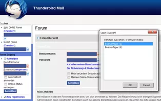 • Das war ein guter Hinweis und ich kann das so für das Thunderbird Forum bestätigen. Genaugenommen ist es so: Auf http://www.thunderbird-mail.de/forum/ befindet sich nur ein Loginformular (links) und in SecureLogin gibt es dort auch keine Wahlmöglichkeit zwischen mehreren Einträgen. Öffnet man jedoch einen Link aus einer Benachrichtigungsmail (Link in etwa so: http://www.thunderbird-mail.de/forum/viewtopic.php?*) gibt es zwei Loginformulare: links und mittig auf der Seite.
