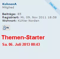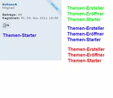 • Ich bin auch für eine Kennzeichnung des Threadstarters und vertraue darauf, dass das Template dafür so erstellt wird, dass wir die Ausgabe auch nach unseren Wünschen "stylen" können.