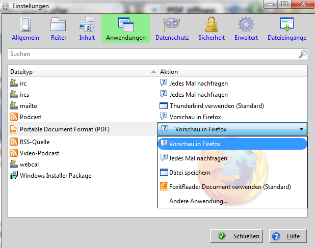 Seit einiger Zeit kann ich PDF Dateien beim Herunterladen nur noch speichern. Ich weiss nicht, ob dies mit einem Versionswechsel von FF zu tun hat. Vorher wurde mir beim Download immer die Auswahl zwischen "Oeffnen" und "Speichern" angeboten.