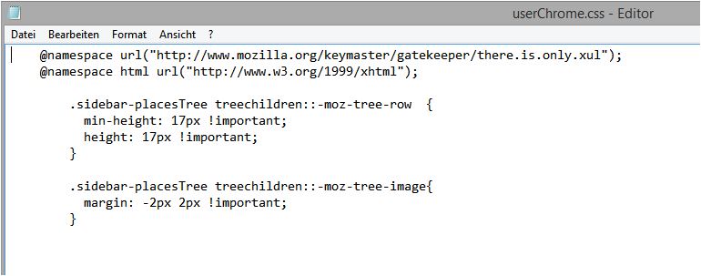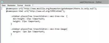 anschließend folgt der von dir gewünschte Code.Dann schließt du die Datei und speicherst sie als userChrome.css ab.